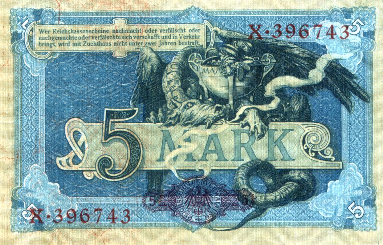 При этом изображение на денежном суррогате представлено в виде триптиха, то есть поделено на три части. Самый интересный, конечно же, центральный, где Зигфрид показан сражающимся с гномами-нибелунгами. Одного из них герой эпоса пытается придушить руками, а бездыханное тело другого брошено к его ногам. Можно предположить, что речь тут идет о споре братьев-цвергов Шильбунга и Нибелунга о том, как поделить доставшиеся им богатства. В качестве судьи карлики пригласили наследника Зигфрида, но в процессе дележа все трое переругались, и герой в порыве гнева убил обоих фюрстов-коротышек. Не совсем, правда, понятно, что на куче драгоценностей делает поверженный дракон Фафнир – его Зигфрид сразил раньше и в другом месте. Но, возможно, это всего лишь намек на прежние подвиги героя либо указание на сокровища самого чудовища, которыми Зигфрид завладел прежде. Кстати, Фафнира и его богатства можно увидеть на пятерке кайзеровской Германии 1904 года: