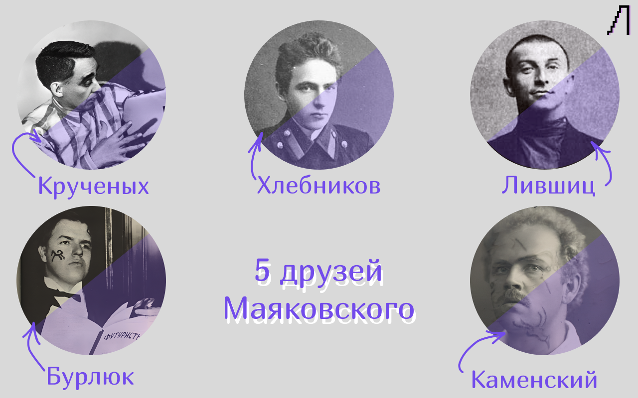 Группа футуристов «Гилея», в деятельности которой участвовал Владимир Маяковский, сформировалась в 1910-е годы; позднее она была переформатирована, войдя в творческое объединение авангардистов «Союз молодёжи», и окончательно распалась к середине 1910-х. Свои художественные принципы группа изложила в манифесте «Пощёчина общественному вкусу» (1912). Предлагаем вам ознакомиться с некоторыми её участниками и друзьями Маяковского.