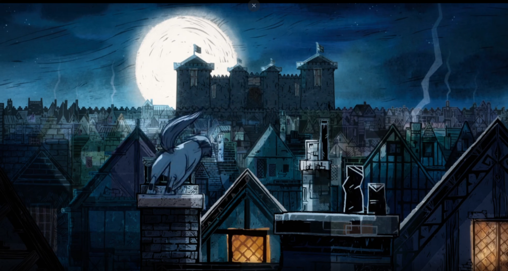 Начнем с того, что оно явно членится на две части: город и лес. Выражается это в том числе и графически: город кажется плоским, например, изображенный пол становится буквально фоном, как будто фигура героини наложена сверху. Этот мир изображается резкими линиями и углами, при этом используются бледные, серые и неяркие цвета.