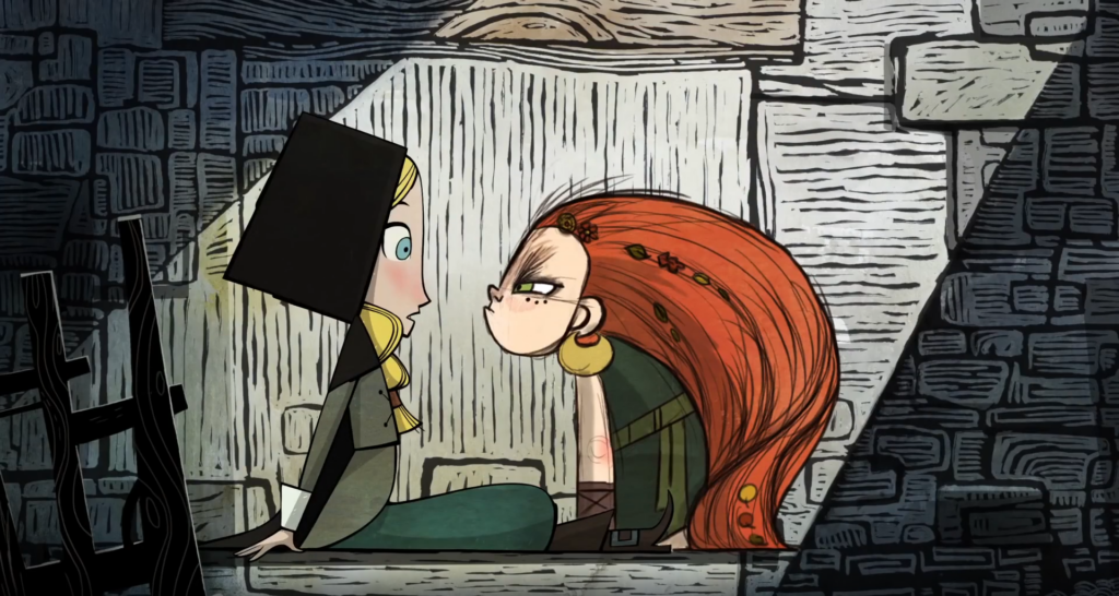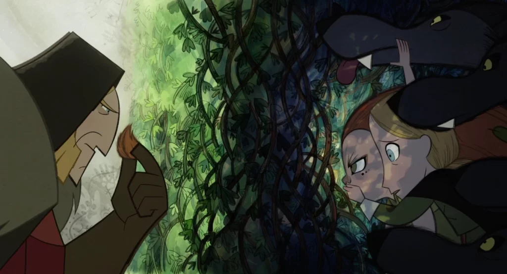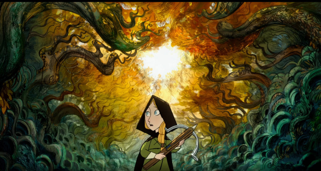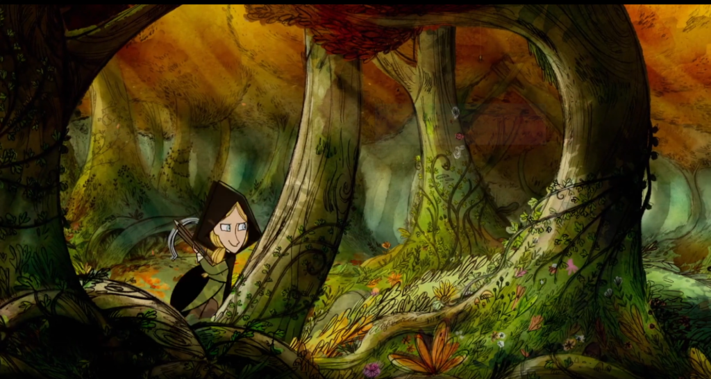 Лес же, как сказочно-мифическое пространство, характеризуется волнистыми линиями, намеренным подчеркиванием объема. Более того, пока герои идут среди деревьев, они несколько раз проходят через округлые арки (что полностью противопоставлено городу по принципу линия — круг). Интересно, что особой функцией у кельтов обладали спирали, круги и камни, которые также присутствуют и в мультфильме. Цвета, в противовес городским, используются яркие.